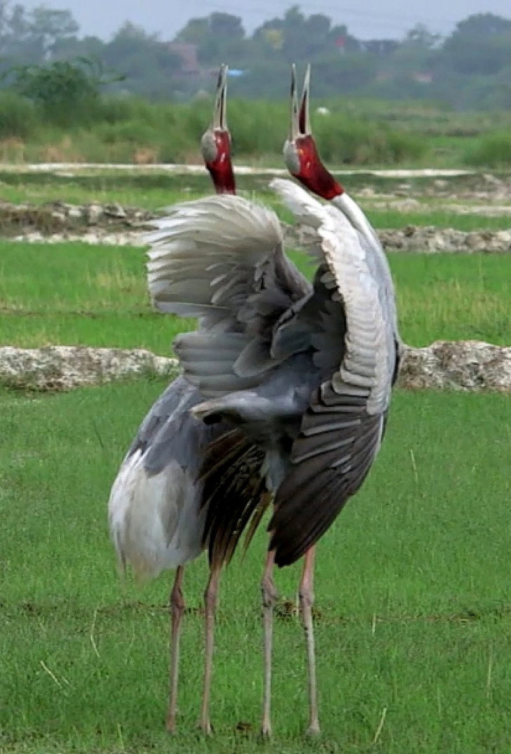 Sarus cranes are regarded as the least social crane species. They can be very protective when nesting and are aggressive towards intruders.