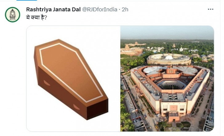 The Rashtriya Janata Dal (RJD) on its official Twitter handle posted two photographs -- one is the aerial view of the newly built Parliament and the other is a coffin and also gave a caption "What is this (Ye Kya Hai)".