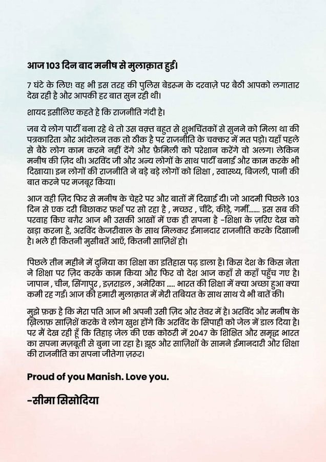 "I am proud that my husband is still filled with the same determination and spirit. Those who conspire against Arvind and Manish will be happy that they have imprisoned one of Arvind's soldiers. But I see that within the confines of Tihar Jail, the dream of an educated and prosperous India in 2047 is being woven with strength. Honesty and the politics of education will definitely triumph over lies and conspiracies. Proud of you, Manish. Love you. - Seema Sisodia," her letter read.