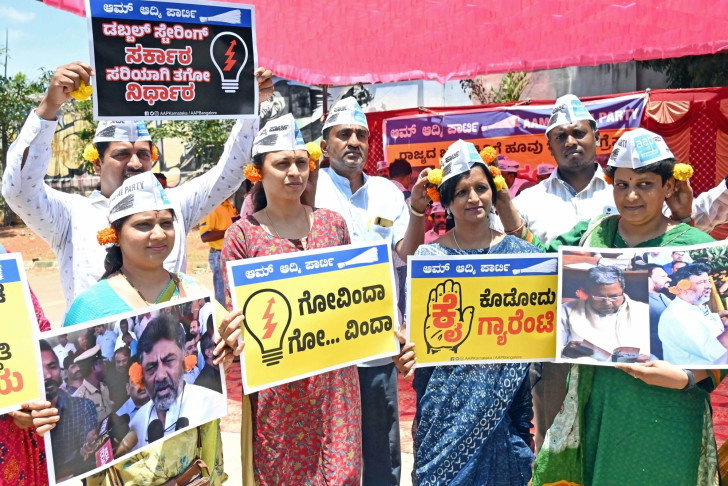 The Karnataka unit of Aam Aadmi Party (AAP) on Friday organised a protest against the Siddaramaiah-led government in the state for imposing conditions on the guarantee schemes promised ahead of the May 10 Assembly polls.