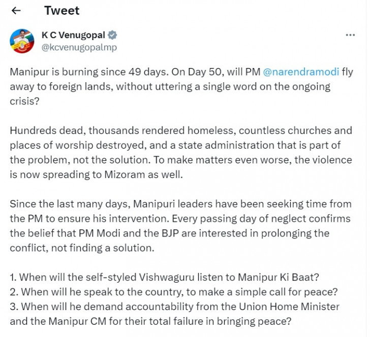 In a tweet, Congress General Secretary (organisation) K.C. Venugopal said, "Manipur is burning since 49 days. On Day 50, will PM Narendra Modi fly away to foreign lands, without uttering a single word on the ongoing crisis? Hundreds dead, thousands rendered homeless, countless churches and places of worship destroyed, and a state administration that is part of the problem, not the solution. To make matters even worse, the violence is now spreading to Mizoram as well."