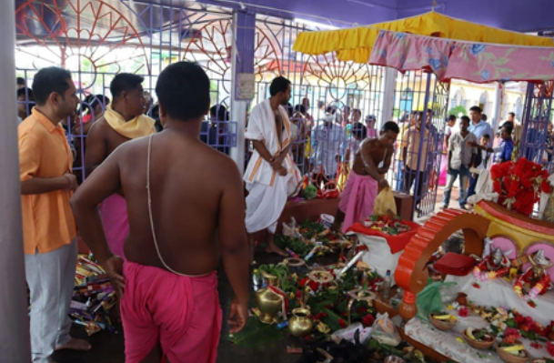 Writer and historian Salil Debbarma said that the worship starts with the dipping of 14 deities in the Howrah River, followed by the sacrifice of 108 animals in the presence of hundreds of thousands of devotees, all at government expense.