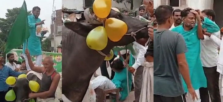 The eyewitnesses said that the party supporters were parading in the village with Kedar Yadav riding the buffalo. They had adorned the animal with balloons. Kedar Yadav was holding the cake while riding the buffalo when the incident took place.