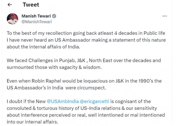 Congress leader Manish Tewari slammed the government, and in a tweet said, "To the best of my recollection going back at least four decades in Public life I have never heard an US Ambassador making a statement of this nature about the internal affairs of India."