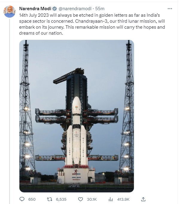 "14th July 2023 will always be etched in golden letters as far as India's space sector is concerned. Chandrayaan-3, our third lunar mission, will embark on its journey. This remarkable mission will carry the hopes and dreams of our nation," PM Modi said in a series of tweets.