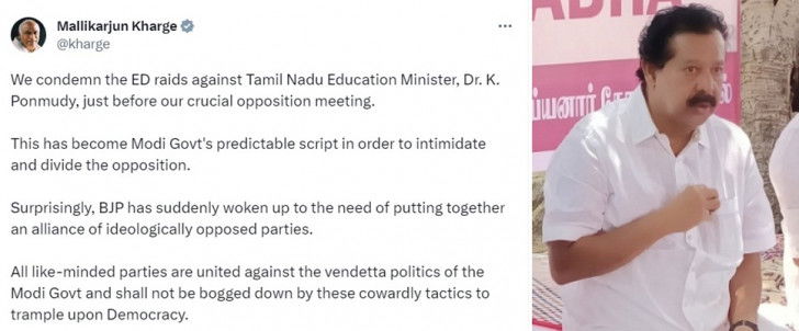 In a lengthy Twitter post, Kharge said: "We condemn the ED raids against Tamil Nadu Education Minister Dr. K. Ponmudy, just before our crucial opposition meeting. This has become Modi govt's predictable script in order to intimidate and divide the opposition.