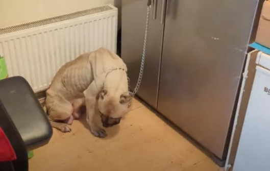 He found Sasha, a Presa Canario dog, tethered to a freezer by a metal chain, appearing extremely underweight with her spine, ribs and pelvic bones visible.