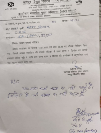 The zonal chief engineer served a show cause notice to one of the staff in the electricity department (Jaipur discom) in Kota.