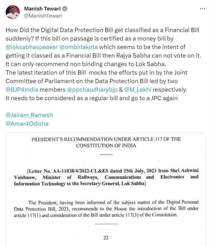 He also attached the image of the President's Recommendation under Article 117 of the Constitution which read, "The President, having been informed of the subject matter of the Digital Personal Data Protection Bill, 2023, recommends to the House the introduction of the Bill under article 117(1) and consideration of the Bill under article 117(3) of the Constitution" .