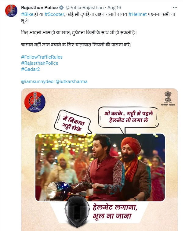 Rajasthan Police creative tweet on wearing helmet from 'Gadar-2' goes viral