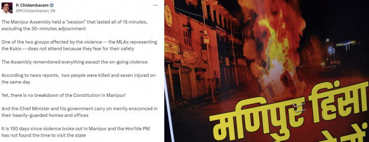 In a tweet, Chidambaram said: "The Manipur Assembly held a 'session' that lasted all of 15 minutes, excluding the 30-minutes adjournment. One of the two groups affected by the violence -- the MLAs representing the Kukis -- does not attend because they fear for their safety.