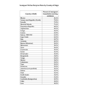 The figures are presented across two tables and together form a single dataset. They show the share of immigrant households in the United States receiving government assistance. The rates range from above 80 per cent to just under 40 per cent.