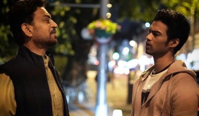 Another picture features Irrfan Khan and Babil standing face-to-face outdoors at night. The background is softly blurred, with streetlights and bokeh effects adding a dramatic effect.