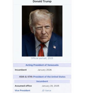 The photo seemed to be of an edited Wikipedia page, where Trump is shown as the 'incumbent Venezuelan president' as of January 2026. It also mentions his actual official posts -- the 45th and 47th President of the United States.