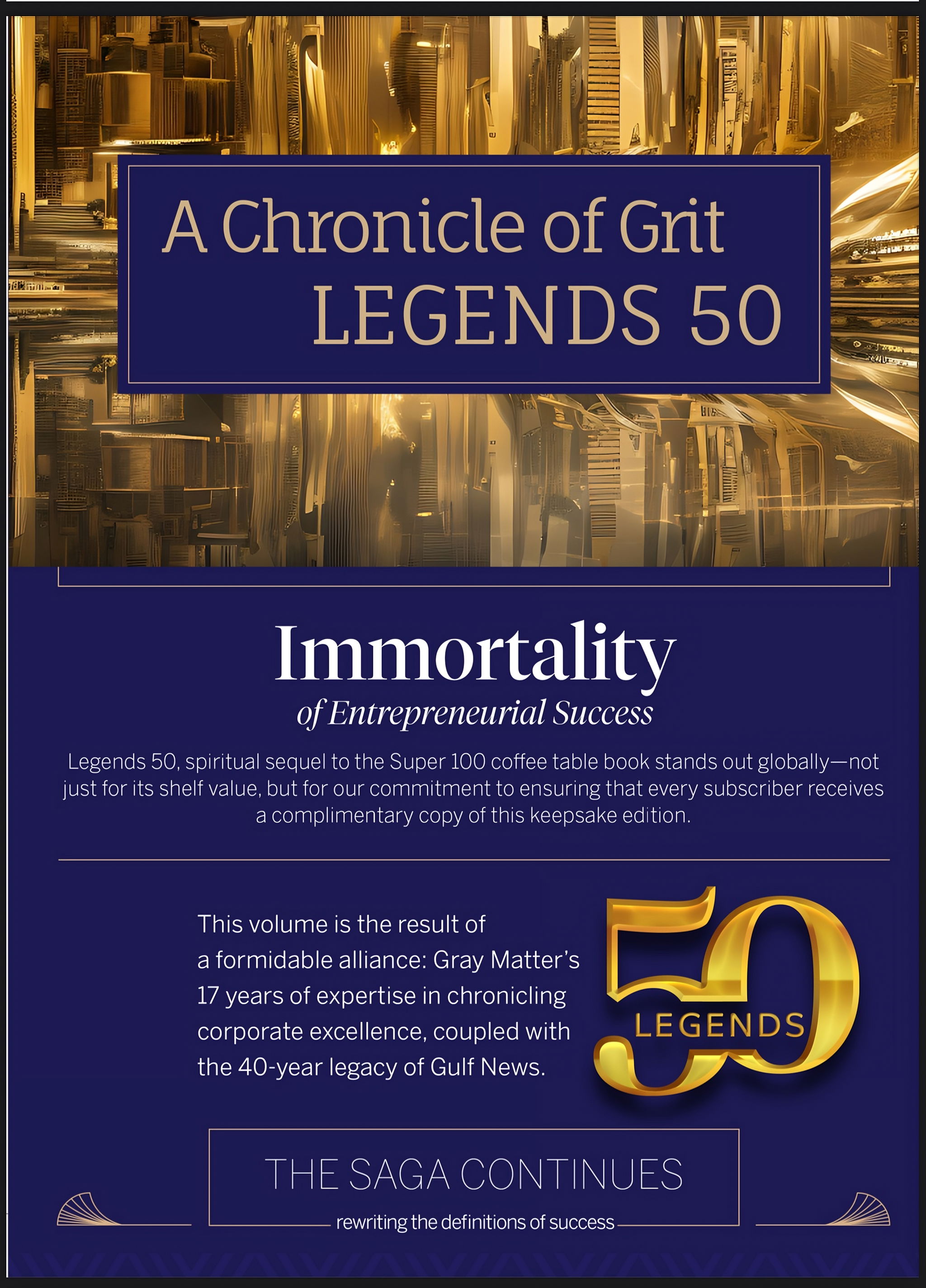 As Legends 50 reaches readers across the UAE, it serves as a record of a specific period in the region’s business history. It ensures entrepreneurial achievements are documented over time, recognising those who contributed to the region’s transformation while being supported by favourable government policy. For business leaders, aspiring entrepreneurs and general readers, Legends 50 offers insight into what can be achieved when vision and opportunity intersect.