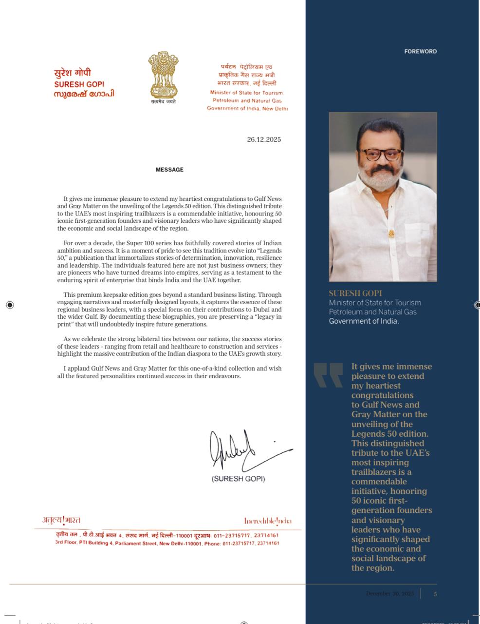 The publication also includes a foreword by Suresh Gopi, Minister of State for Tourism, Petroleum and Natural Gas, Government of India, who describes the book as a tribute to the UAE’s inspiring business figures and acknowledges the role these leaders played in shaping the region’s economic and social landscape.