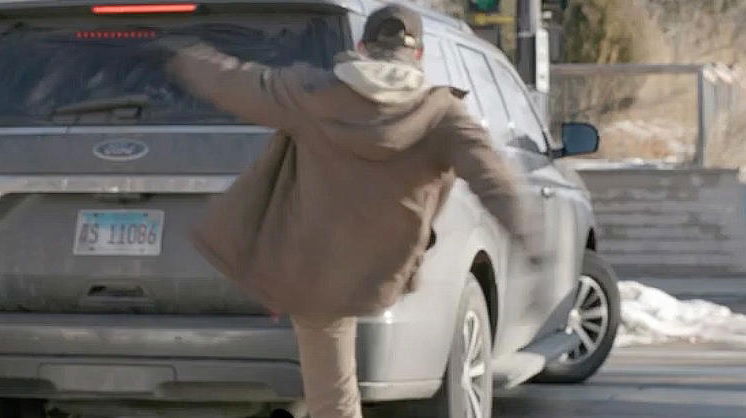 Before kicking the taillight of a government SUV and breaking it, the man is seen yelling and spitting at federal agents. Agents get out of the car, approach him, and drag him to the ground while he continuously yells "f--- you" and gives the double middle finger.