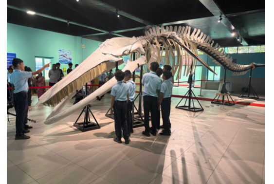 The whale skeleton, recovered from a Bryde’s whale that stranded on Kozhikode beach in October 2023, drew large crowds and left visitors visibly awestruck.