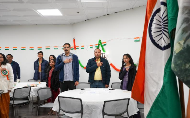 The program began with the American national anthem sung by Nithika Rangan, followed by a heartfelt rendition of India’s national anthem, Jana Gana Mana, performed by Nithika, evoking pride in India’s history, traditions, and sacrifices. The audience responded with spirited chants of “Bharat Mata Ki Jai.” Event MCs Anupriya Ramraj and Rajesh Yekkali welcomed attendees and set the tone for the evening.