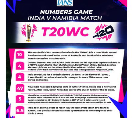 India scripted history on Thursday with consecutive 10th victories in the T20 World Cup tournament after thrashing Namibia by 93 runs in the Men’s T20 World Cup at the Arun Jaitley Stadium.