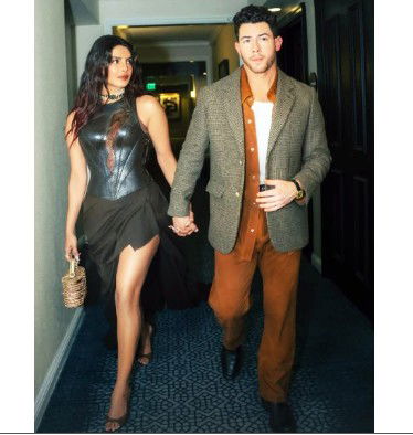 In the picture shared by Nick, Priyanka and him are seen walking down a corridor with a lot of love for each other, holding hands. Priyanka is seen wearing a striking black structured cuirass-style bodice and a draped skirt with a thigh-high slit and a flowing trail. Nick complemented her in classy brown blazer.