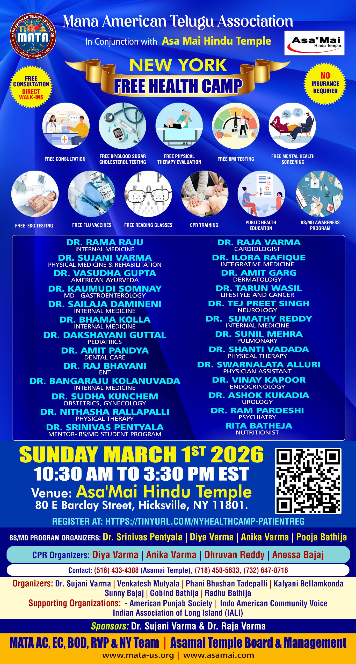 MATA is hosting a Mega Health Camp in collaboration with Asa Mai Temple, in Hicksville, New York, on Sunday, March 1, 2026.
