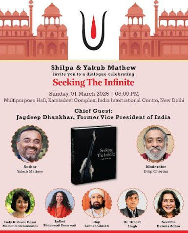 New Delhi, March 1, 2026 — The India International Centre (IIC) will host the formal launch of Seeking The Infinite by author and global banking executive Yakub Mathew, at a ceremony presided over by former Vice President of India Shri Jagdeep Dhankhar. The event, scheduled for Sunday, March 1, 2026 at the Kamladevi Complex at The India International Centre in New Delhi, is expected to draw an assembly of distinguished leaders from the fields of spirituality, academia, literature, and public life.