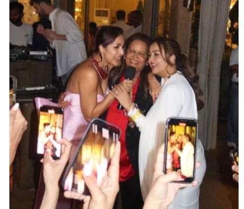 The picture captures an intimate throwback birthday celebration moment, with Malaika and her sister Amrita Arora standing close to their mother as they sing into a mic together.