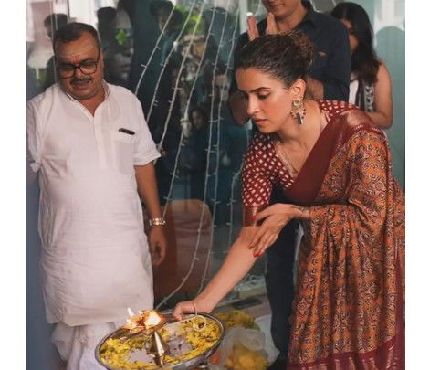Taking to Instagram, Sanya shared a peep into the auspicious beginning of Sundar Poonam, sharing a series of moments from the film’s puja ceremony. The actress posted glimpses of the clapboard, pictures of herself performing the aarti, and candid frames with her co-stars.