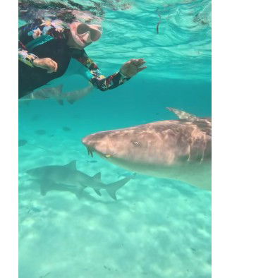 In another video clip, she is seen swimming closely with the trainer while sharks move around them.