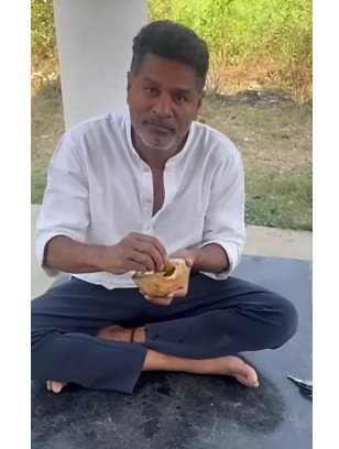 In the video, Prabhu Deva is seen sitting on the floor with his legs crossed at the entrance of a modest village home. He is dressed in a simple white kurta and dark pants and is seen enjoying a fresh coconut.