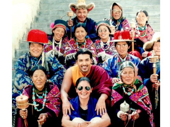Talking about the picture shared, Pooja Bhatt and John Abraham are seen sitting on stone steps, surrounded by local residents of Kaza in Spiti Valley.