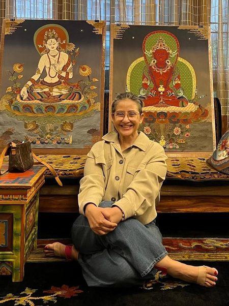 In the pictures shared by the actress, Manisha is seen seated on the floor, posing alongside artists, admiring detailed Thangka artworks.