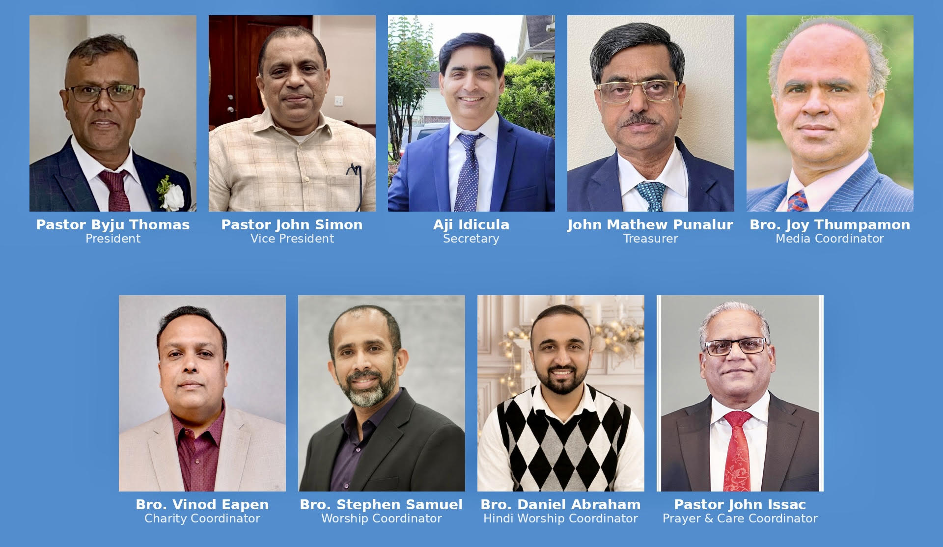 Other key positions include Joy Thumpamon as Media Coordinator, Vinod Eapen as Charity Coordinator, Stephen Samuel as Worship Coordinator, Daniel Abraham as Hindi Worship Coordinator, and Pastor John Isaac as Prayer Coordinator.