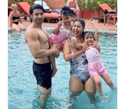 The carousel post begins with a heartwarming pool moment where Gurmeet is seen holding one of their daughters while Debina, dressed in a stylish swimsuit, lifts the other.