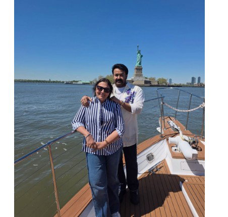 Mohanlal shared a picture of himself with his wife posing next to the Statue of Liberty on Liberty Island in New York Harbor.