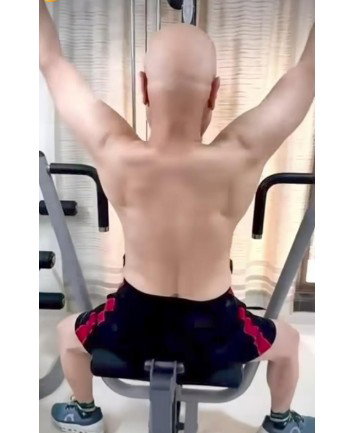 He is seen sitting firmly on the machine, pulling the bar down with controlled movements, showcasing impressive form and discipline.
