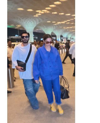 Deepika opted for a relaxed yet chic look, dressed in an oversized royal blue outfit paired with night glares, while Ranveer sported a casual ensemble.
