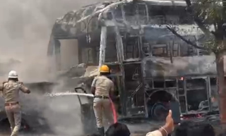 A tragic road accident claimed six lives after a head-on collision between a car and a private bus resulted in a deadly blaze in Yadgir district of Karnataka on Friday....