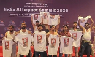 Members of the Indian Youth Congress staged a dramatic protest inside Bharat Mandapam on Friday during the India AI Impact Summit...